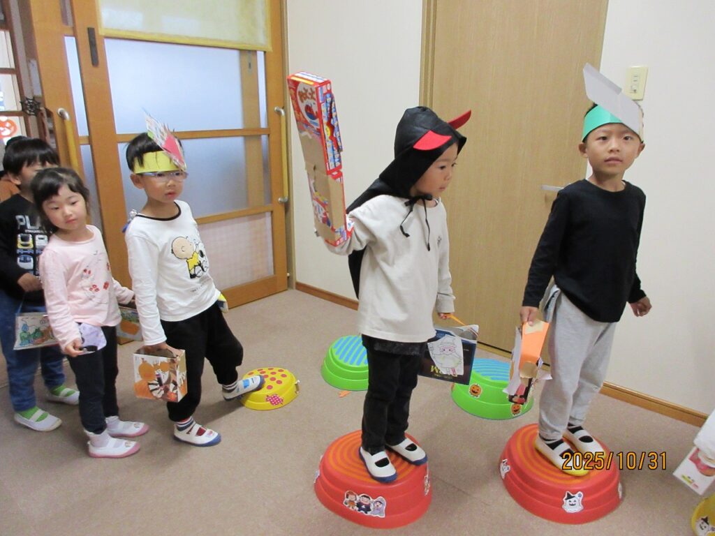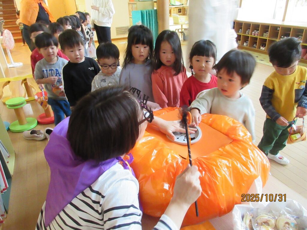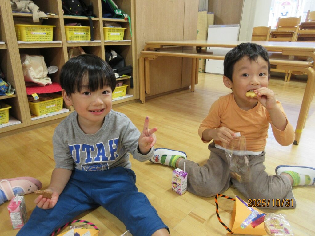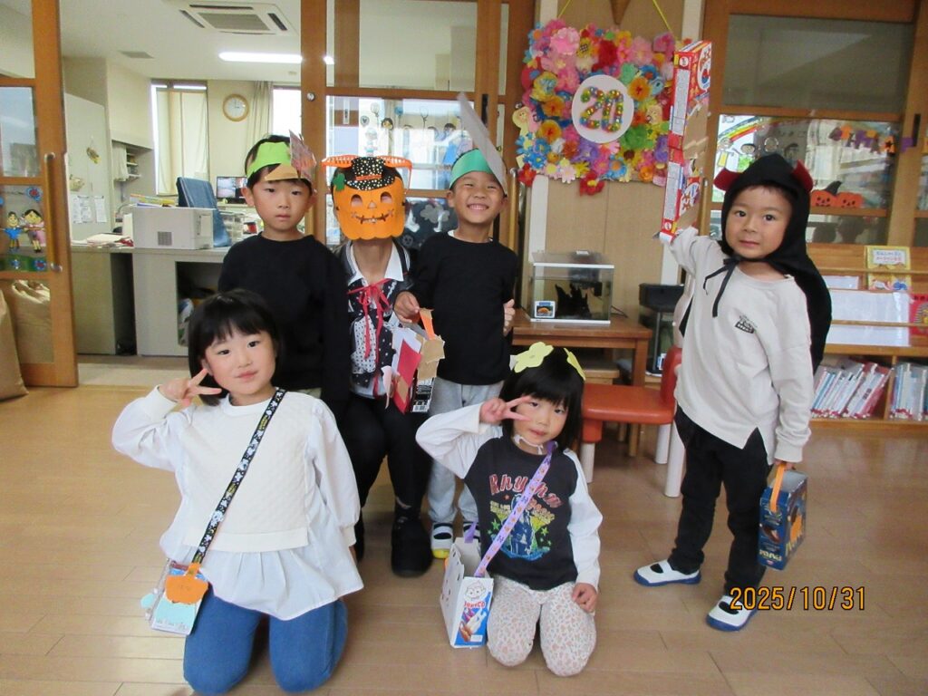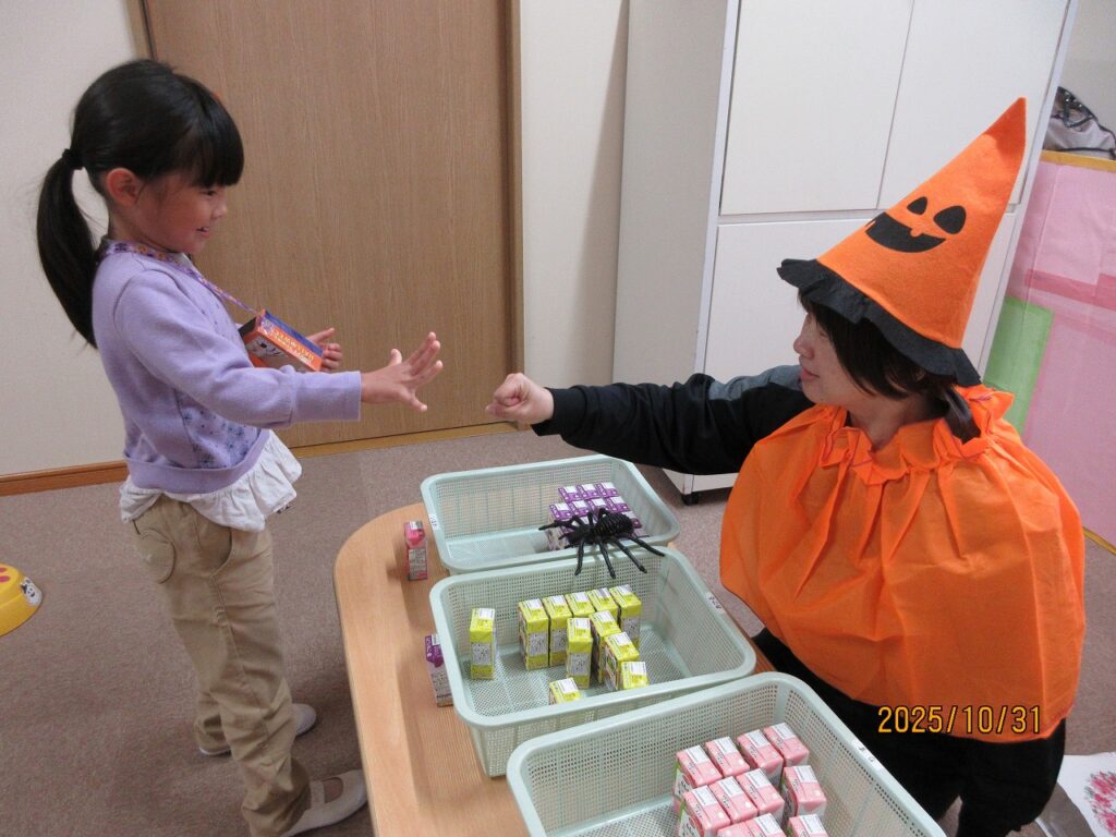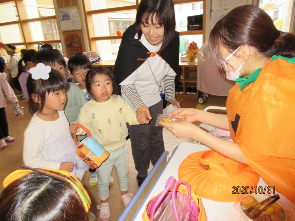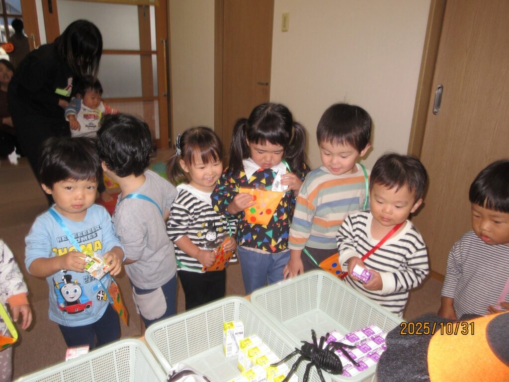 2025.10.31ぴよぴよ ハロウィン 10月31日は、ハロウィン。自分たちで作ったバッグを持ってお菓子をもらいに行きました。くじ引きをしてクッキーをもらったりじゃんけんをしてジュースをもらったりしてゲームをしながら廻りました。小さいクラスの友達も恥ずかしがりなが「トリック オア トリート」と言う姿が見られ、とても可愛かったです。 終わった後は、友達とお菓子を食べ「楽しかったね!」と会話を楽しみながら振り返っていました。