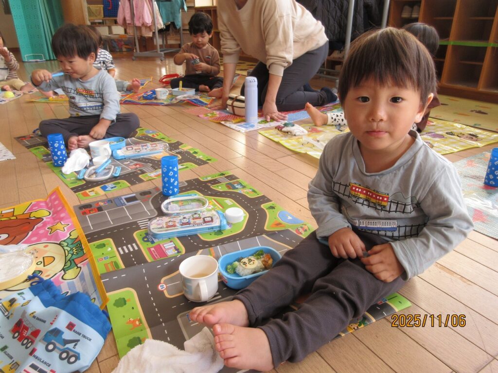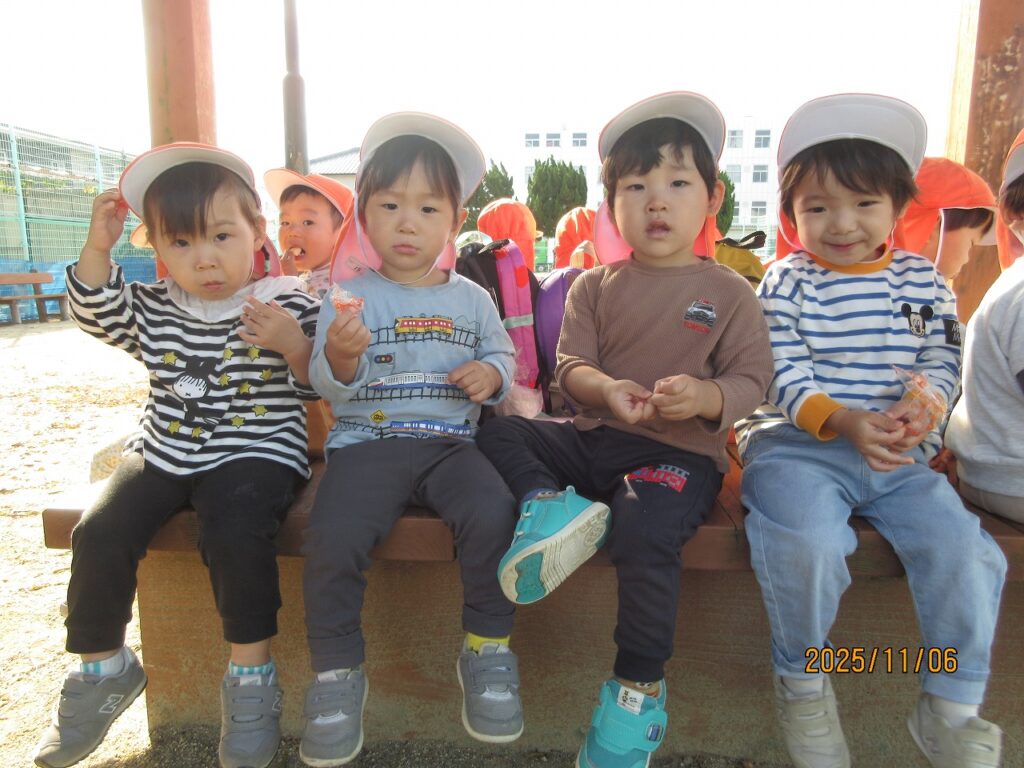 公園に到着し、ちょっとひと休み・・・大りす(2歳児)さんがリュックに入れて運んでくれたジュースとお菓子をみんなで食べて、さらにパワーアップ!!