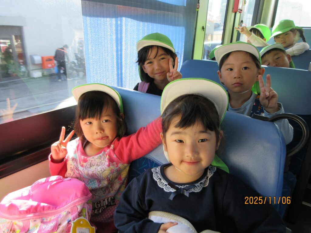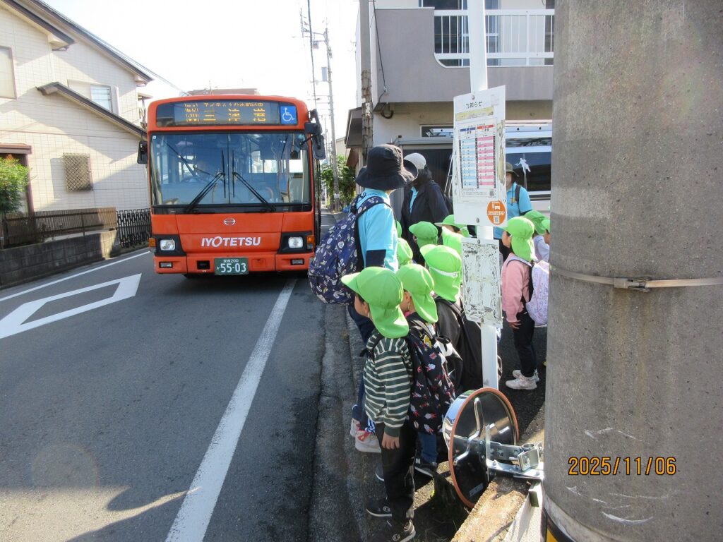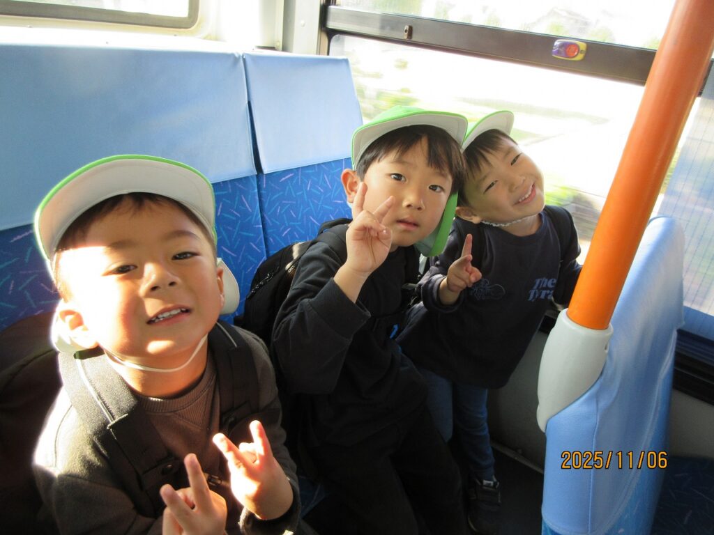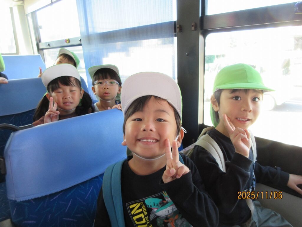 待ちにまった園外あそび!お天気が心配でしたが、みんなの思いが届いたようで良い天気となりました。路線バスに初めて乗る子どもが多く、「バスの中では、静かにしましょう」と話していましたが、嬉しさからかしばらく話が止まりませんでした。(ちょうど、お客さんは乗っていなかったので…)