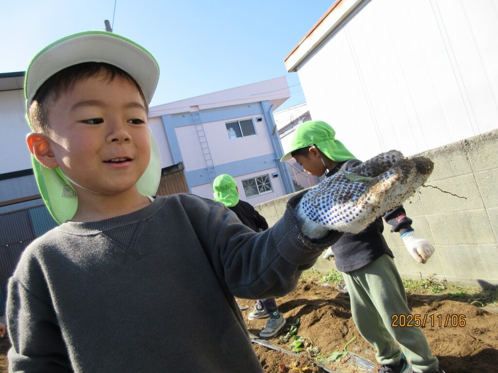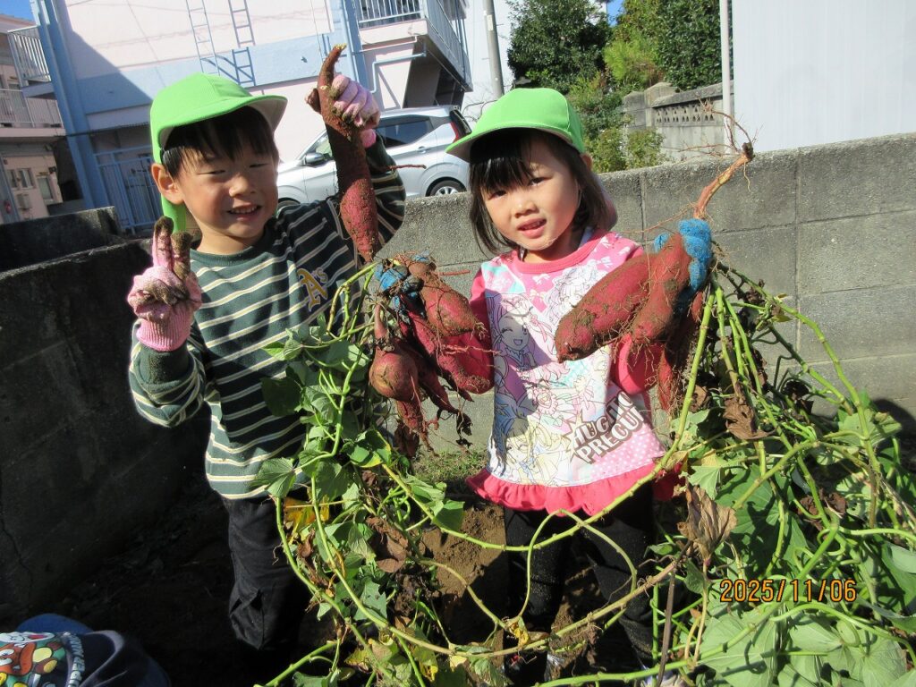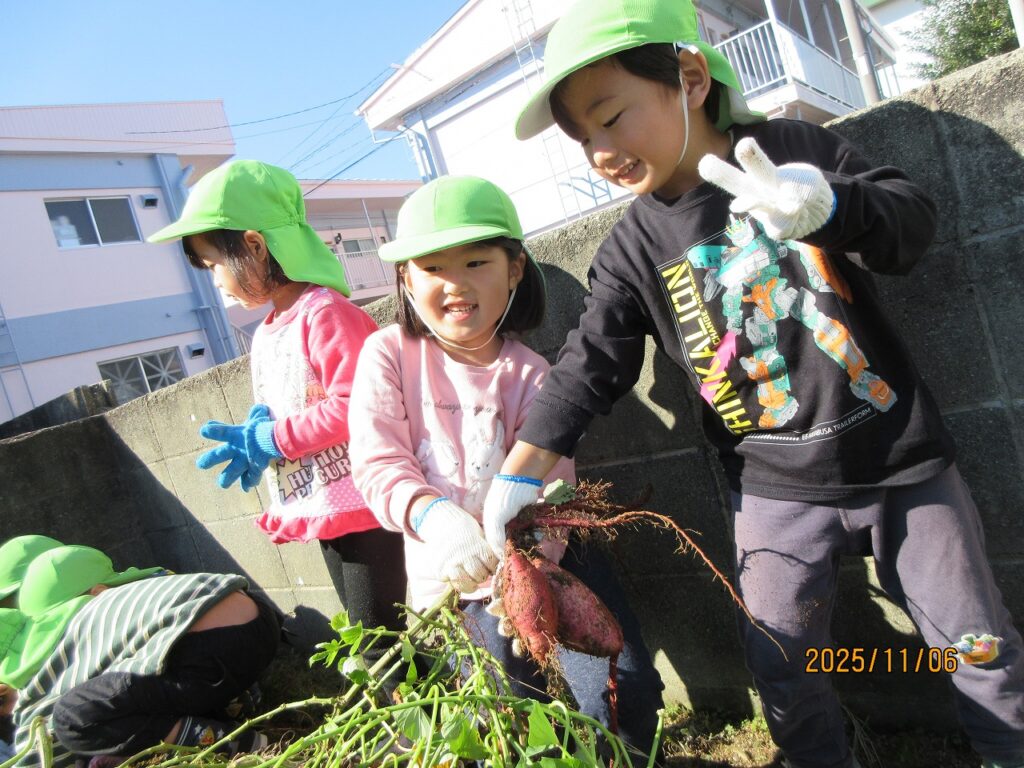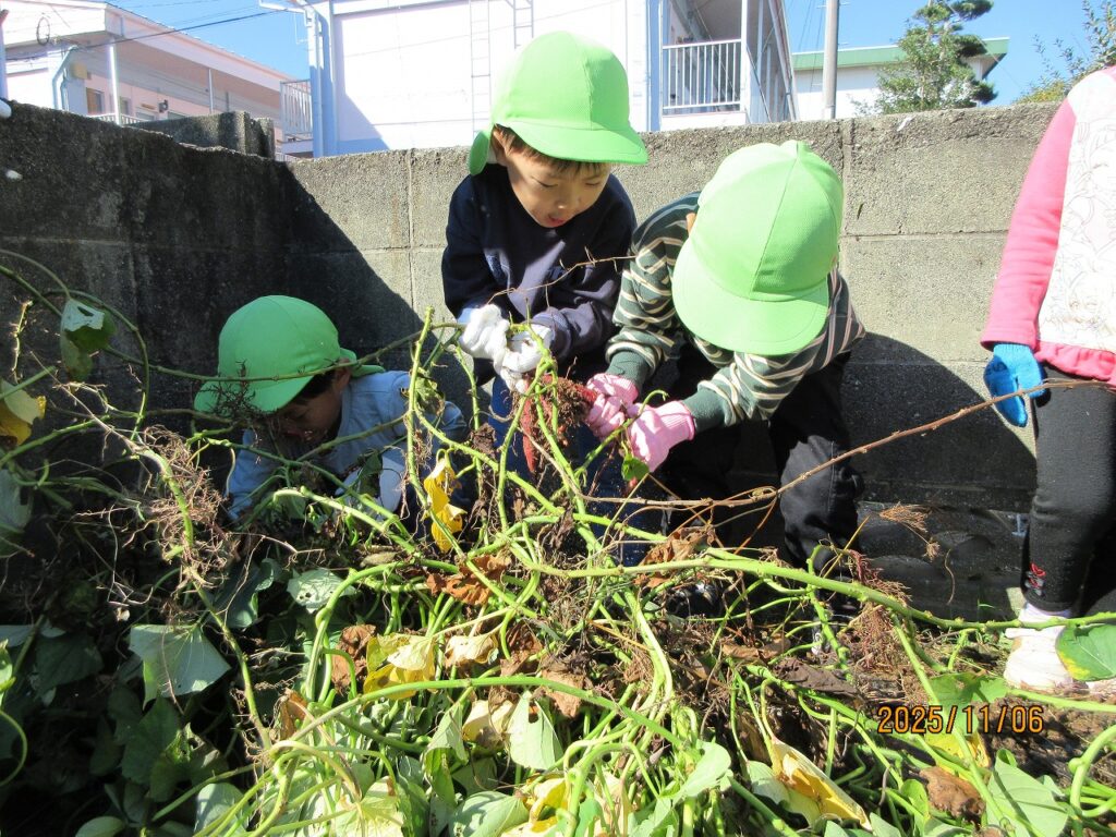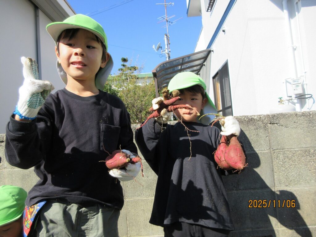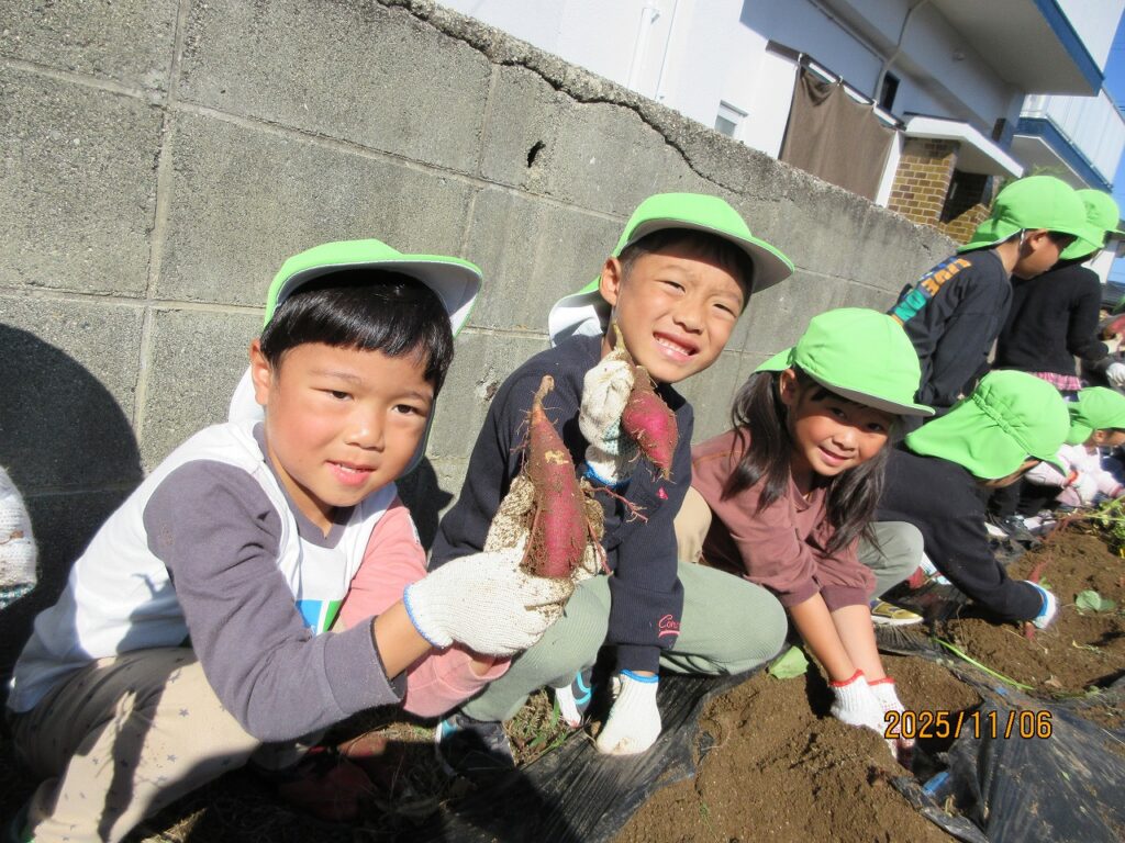 畑に着くと、さっそく愛隣こども園の友達と一緒にいも掘り!友達と一緒にツルを引っ張ったり土を掘ったりしました。芋が取れると「見て!」と満面の笑顔で見せてくれました!芋だけでなく、バッタなどの虫もたくさん出てきて、虫捕りにも夢中でした。