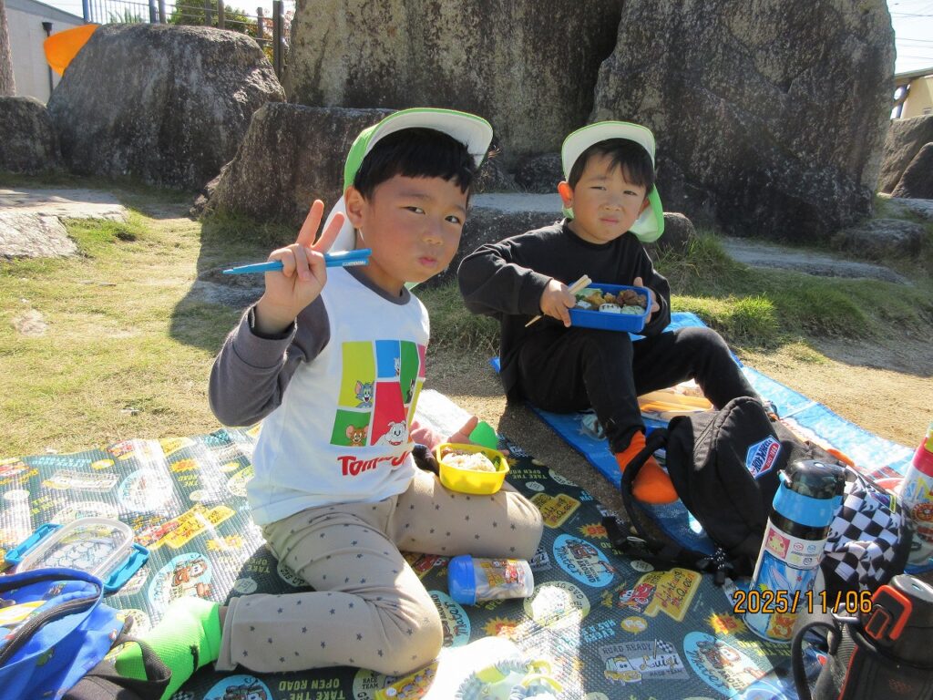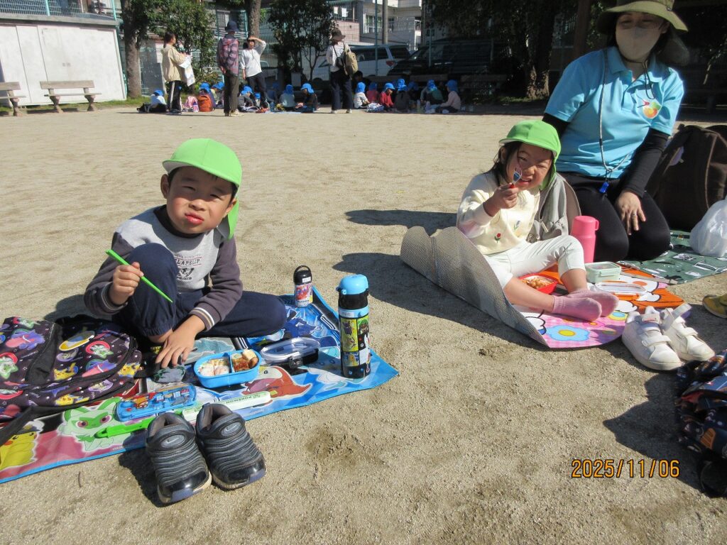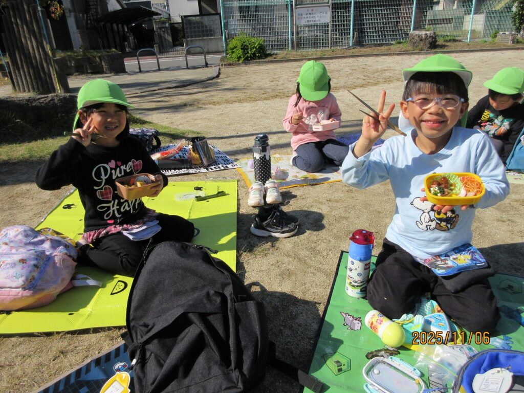 秋の自然をたっぷり満喫した後は、西須賀公園へ。疲れて歩く速度も遅くなっていましたが、お家の人に作ってもらったお弁当を食べると、また元気いっぱい!お忙しい中、お弁当を作っていただきありがとうございました。子どもたちもお弁当を見せ合いながら、おいしく食べていました!