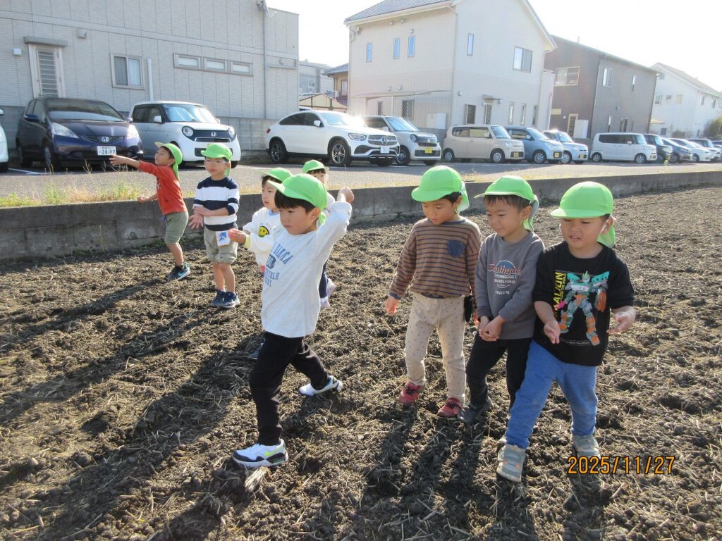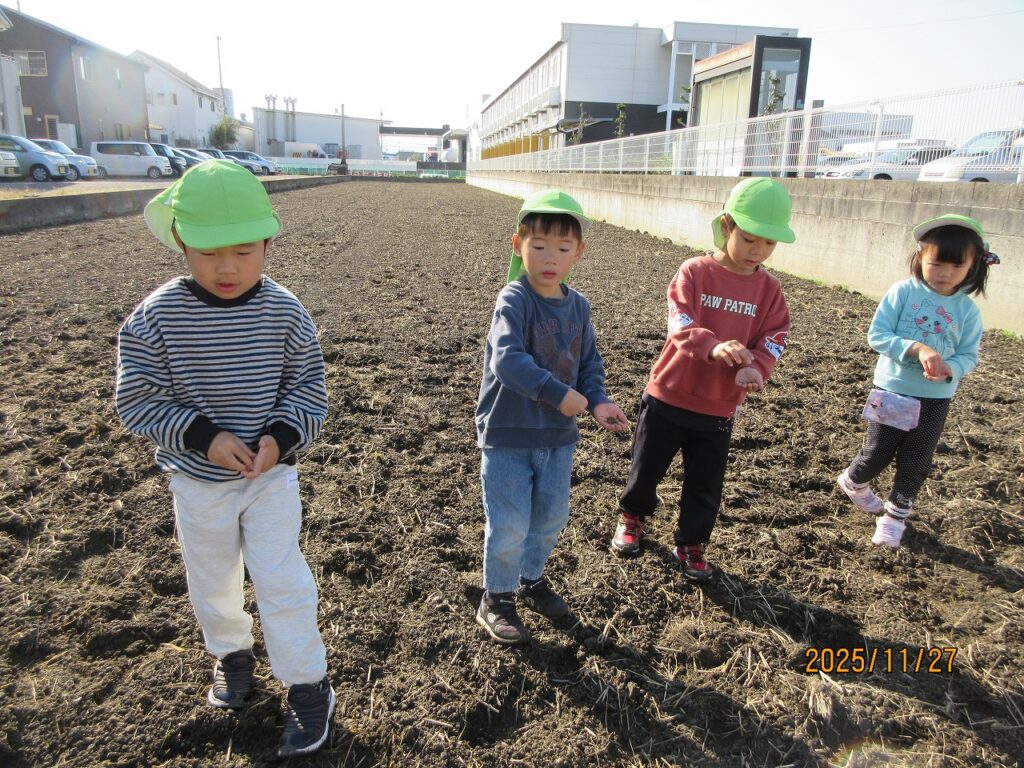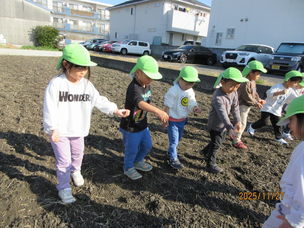 11月末、園の近くの畑へれんげの種まきに出掛けました!1列に並んで、手にのせたれんげの種をパラパラ、少しずつ・・・最後は、豆まきのようにまいてました(笑)春には、れんげの花が畑一面に咲いているといいな~♪