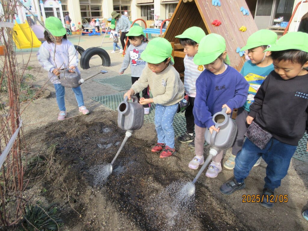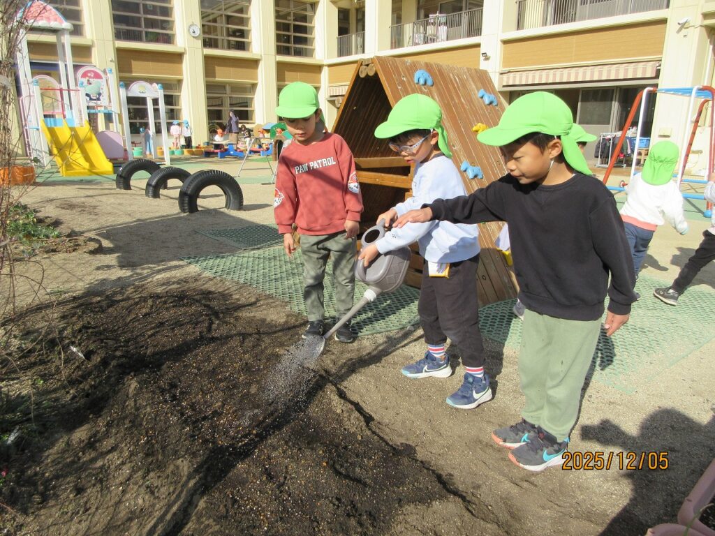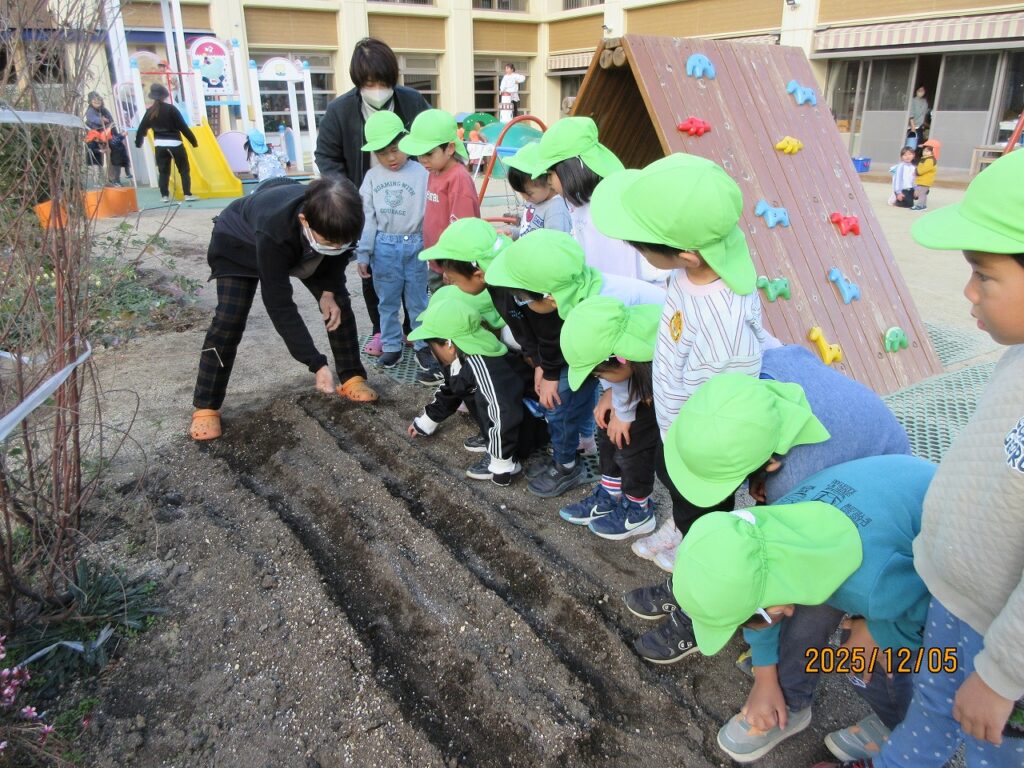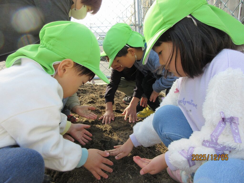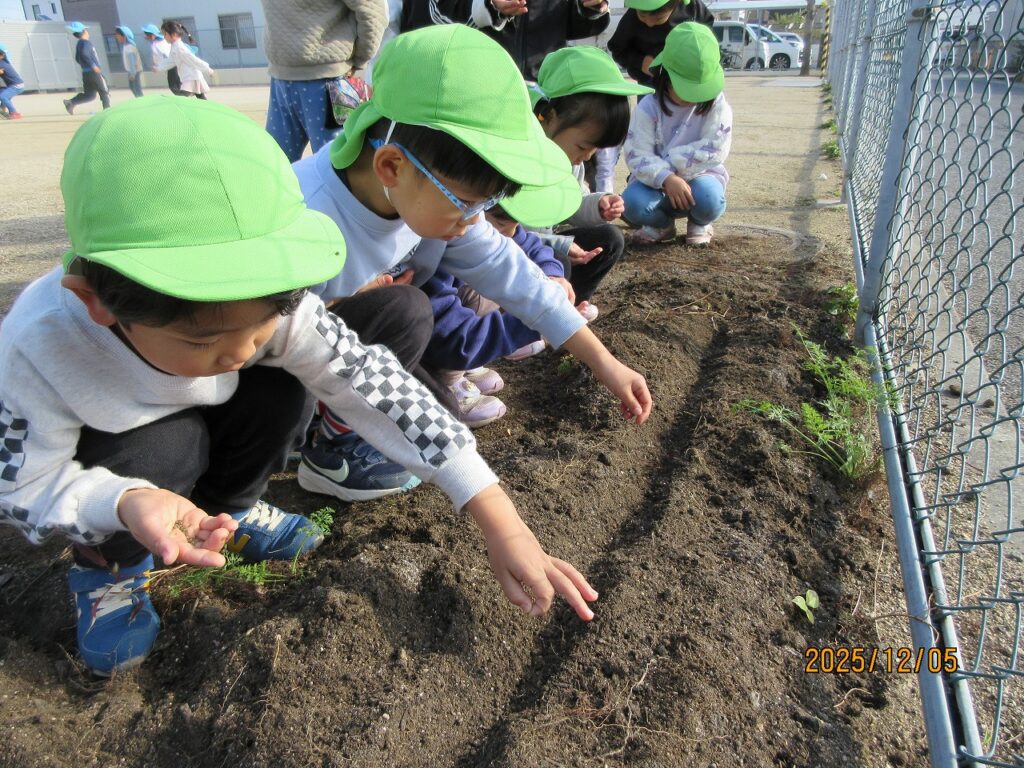 12月は、園の畑に人参の種をまきました!園長先生に教えてもらいながら、みんなで植えました。種を見て「ひまわりの種が小さくなったみたい」と違いを話す姿も見られました。スーパーぺんぎんさんは、昨年の経験から「葉っぱが大きくなってオレンジの頭が顔を出したらとれるんだよ!」と収穫の様子まで教えてくれました。