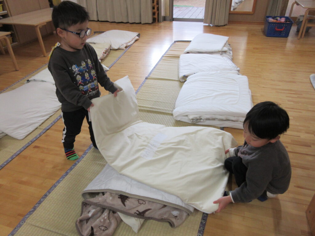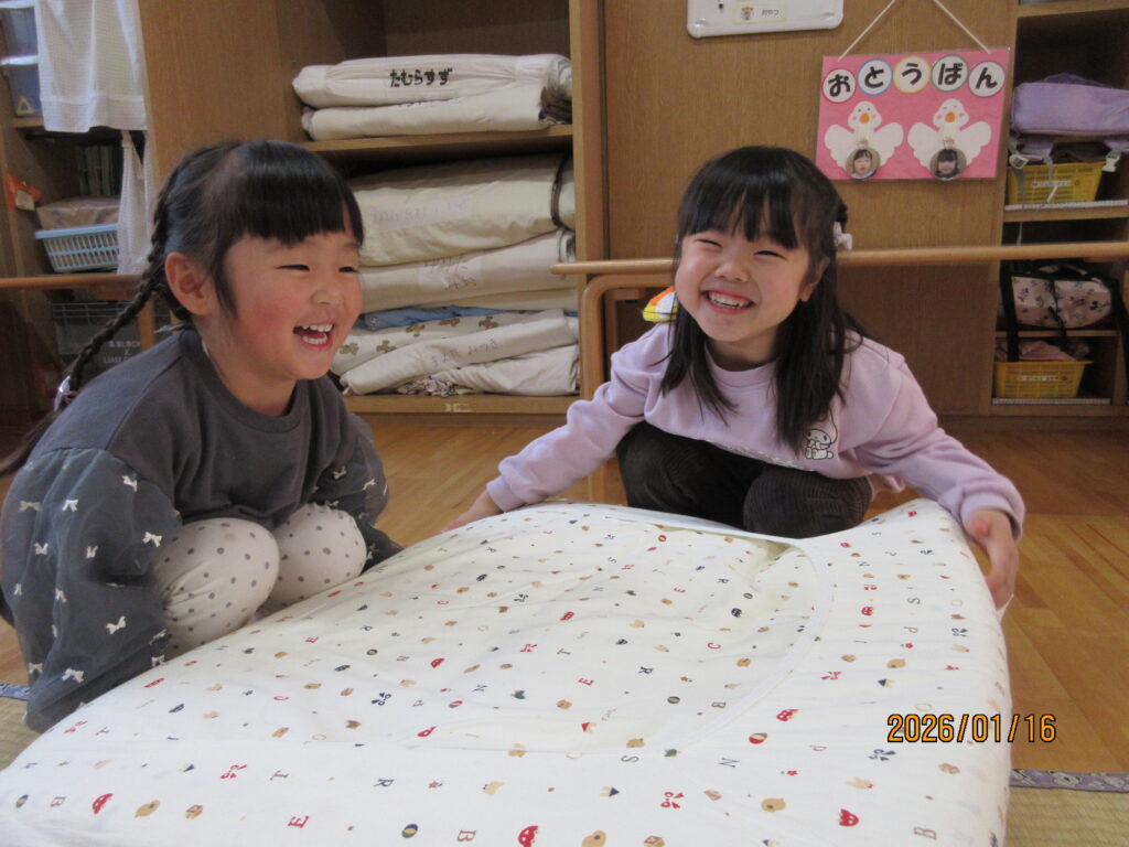 大あひるさんの当番活動が11月から始まり、これまで保育士がしていた仕事(台拭き、布団敷、絵本の整頓、ゴミ集めなど)を行います。