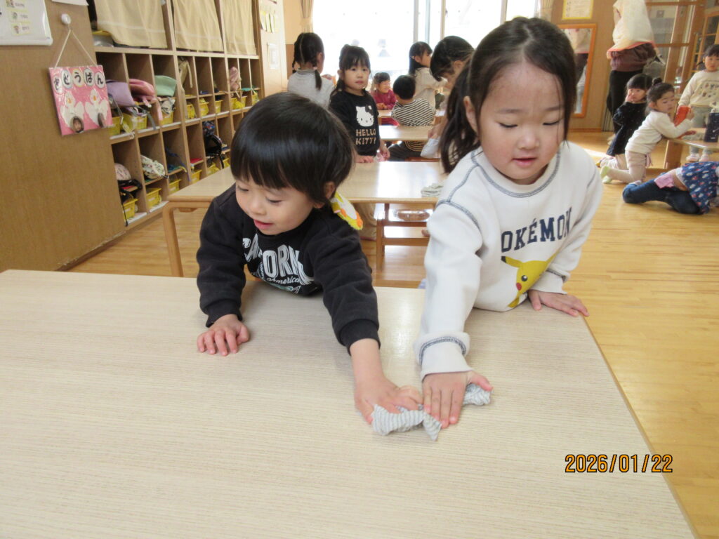 1月から小あひるさんの当番活動も始まりました。これまでの大あひるさんの姿を近くで見ていたことで”待ってましたー!”と言わんばかりに大あひるさん以上にやる気満々な姿が見られます。保育士が思っていた以上に当番の仕事に憧れを持っていたんですねー✨そんな小あひるさんに大あひるさんも「こうやるんよー!」と優しくやり方を教えてあげる姿がとても微笑ましいです💓