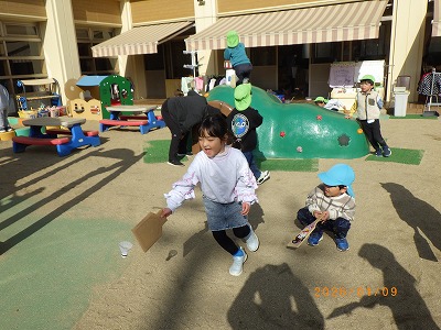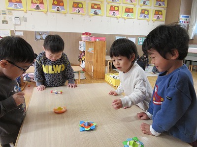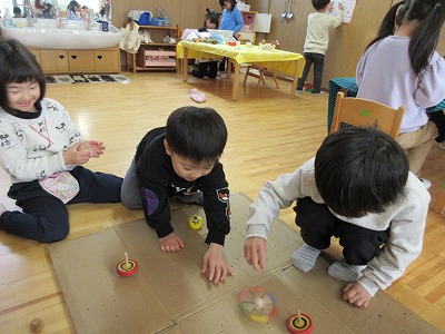 初めは、コツをつかむのに苦戦していましたが、小さいクラスは、器用に指先を動かしコマを回すことができはじめました。回るコマを見て大喜びです。大きいクラスは、コマ回し競争。「誰のコマが一番長く残るかな?!」「やった~!勝ち」と大盛り上がり。