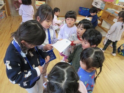 年賀状から手紙に興味を持ち、らいおん組さんが郵便屋さんとなり、郵便ごっこが始まりました。💌あいうえお表とにらめっこしながら自分たちで書きたい文字を探し、友達に手紙を書くことを楽しんでいます。書く喜び、貰う喜びを感じながら、文字が書けない子も保育士に自分の気持ちを伝え書いてもらい心温まるメッセージのやりとりが見られます。今日は、どんなお手紙が届くかな?💓