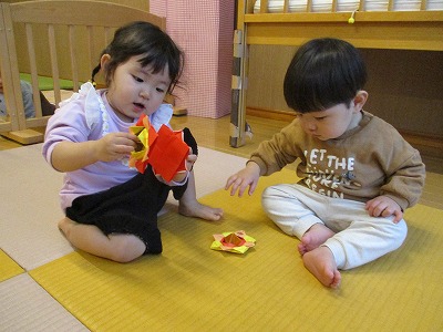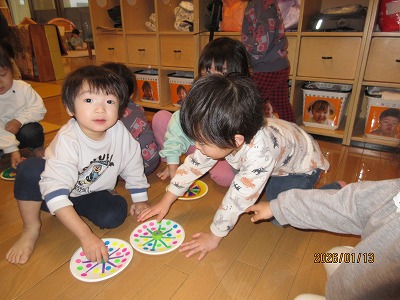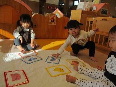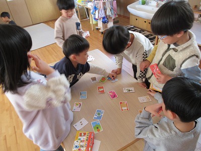 小さいクラスは、絵カルタや福笑いをして遊んでいます。動物や顔の位置もよく理解しており、上手に友達とやりとりを楽しんでいます。大きいクラスは、カルタを通して文字への興味関心も深まり、読み手も自分たちでできるようになっています。札を取るスピードもどんどん早くなり、保育士もそのスピードについていけません。ぜひお家でも子どもたちと勝負してみて下さい!!