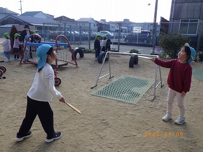 コマやカルタ、羽根つきなどのお正月遊びに親しみ、毎日楽しく遊びました♪