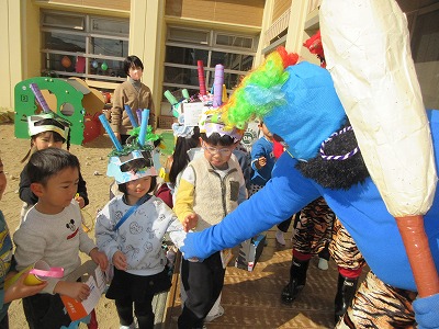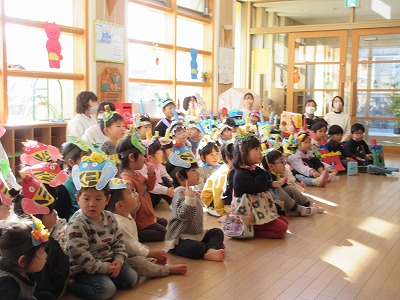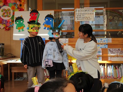 とうとう節分の日がやってきました。集会では、「節分の鬼」というパネルシアターを真剣な様子で見たり鬼ぐいや三方の中に入ってある炒り豆のお話を聞いたりしました。その後、お面の紹介を各クラス2名が代表して発表してくれました。恥ずかしがる友達もいましたが、頑張って作ったところや作っていて難しかったところなど大きな声で教えてくれる子もおり、いろんなお面の紹介でとても盛り上がりました。