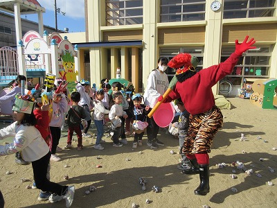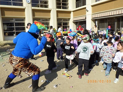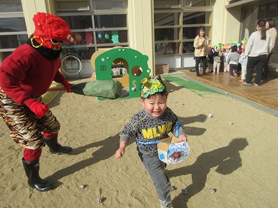 園庭に出ると好き嫌い鬼や怒りんぼ鬼、泣き虫鬼が待っていました。自分の心の中に住んでいる鬼は、どの鬼なのかをじっくりと考えた後、それぞれの鬼の近くへ行き豆まきが始まりました。力強く「鬼はー外」「福はー内」と叫びながら豆まきをしていましたが、途中で本物の鬼が現れるとその大きさや迫力に圧倒され、逃げたり泣いたりする子どもも…