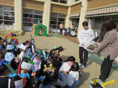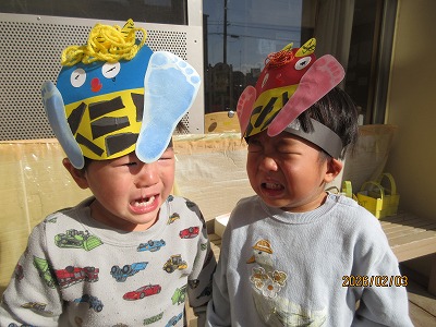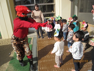 節分の日が近づいてくると、「鬼はー外」「福はー内」と元気いっぱいに叫んで豆まきをする子どもたちの姿が見られ、鬼をやっつける準備をしてきました。怖がらずに心の鬼をやっつけることができるのかな?前日には、らいおん組が炒り豆を作ってくれました。「なんかいい匂いがする」「美味しそう食べてもいい?」と嬉しそうな声も聞こえてきました。