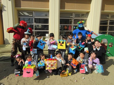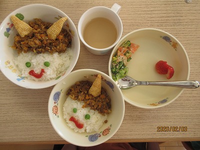 最後には、福の神や鬼と一緒に仲良く写真を撮ることができて嬉しそうな子どもたちでした。昼食では、鬼ドライカレーをみんなで美味しく食べました。作ってくれた調理の先生、ありがとう。