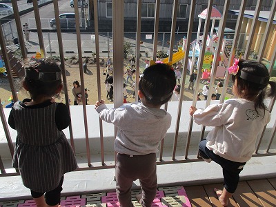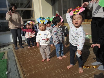 こあら組は、二階のクラスで豆まきをして鬼をやっつけ、テラスからは、1階クラスの豆まきの様子を眺めながら応援しました。