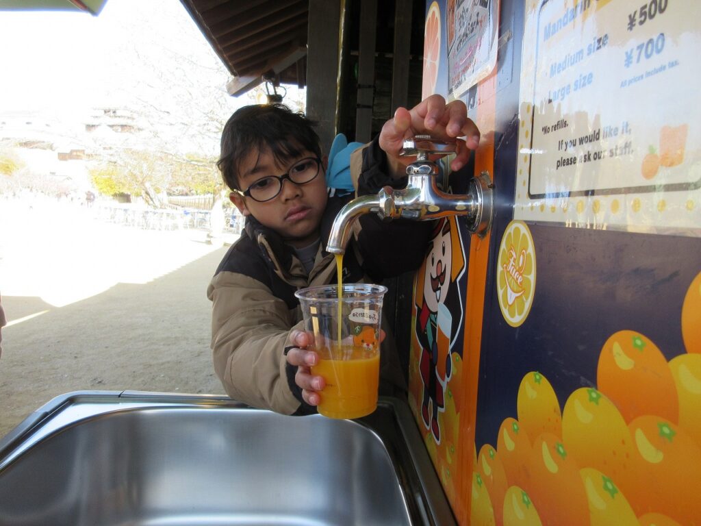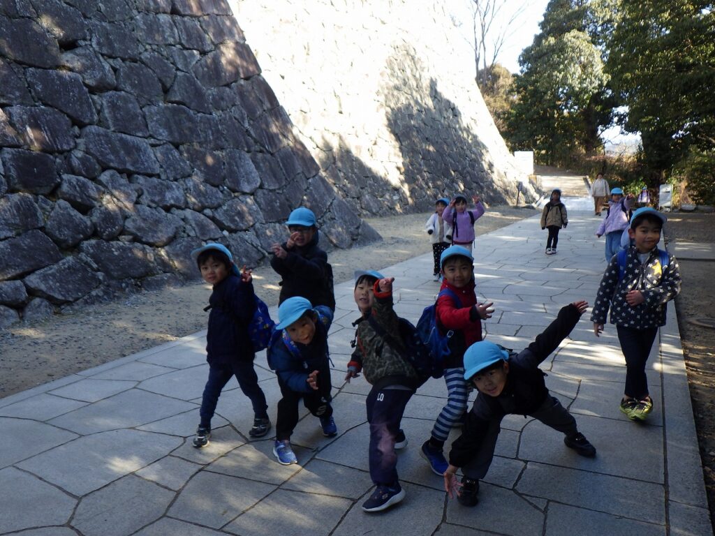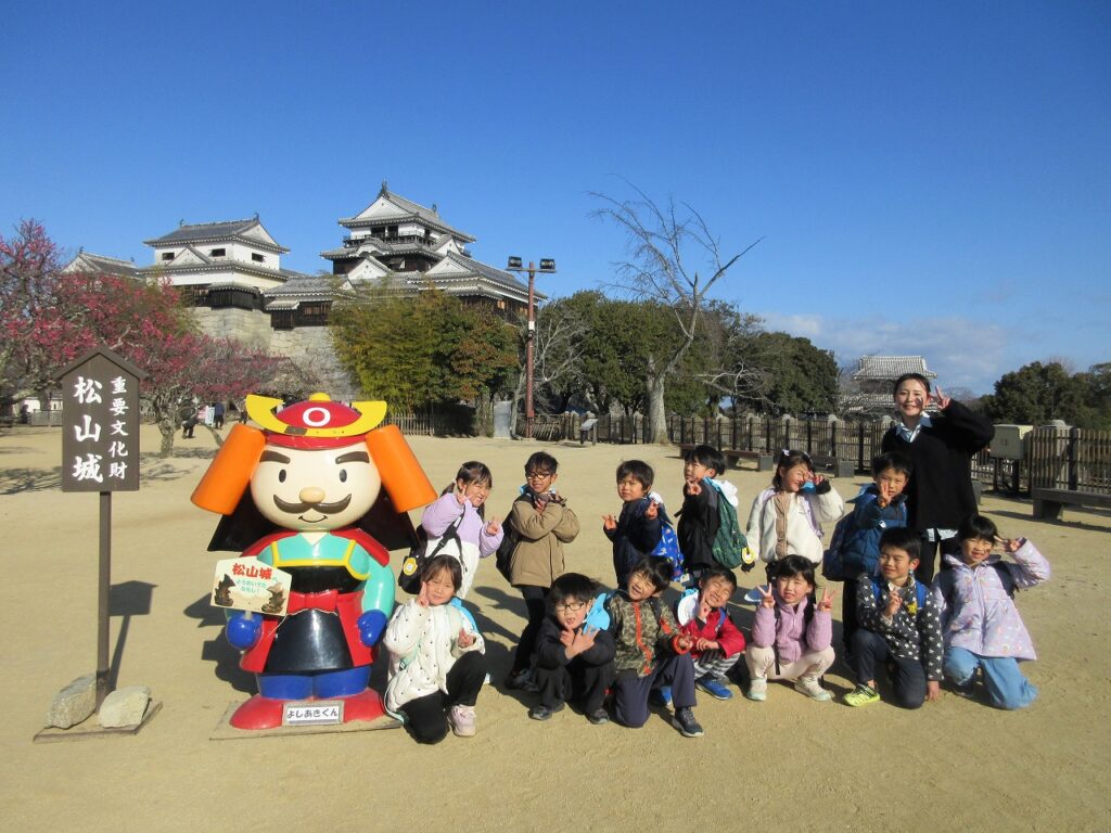 らいおん組になってから、ずっと楽しみにしていた「ハッピーデー」の日がついにやってきました!ワクワクした様子で登園してくる子どもたち。松山城に登る坂道では、元気いっぱい駆け上がり予定時間よりも早く到着。ゆっくり景色を眺め「保育園はあそこかな」「僕の家はあっちかな」と友達と指をさしながら探していました。その後で、蛇口から出るみかんジュースを飲みに行きました。蛇口を前にし、どう使うか分からず戸惑う子どもたち。本当にジュースが出るのかな?とのぞき込む姿も。ひねって出てきたジュースにびっくり!みかんジュースは苦手と言っていた子も、みんなで飲むジュースは美味しかったようでおかわりしました🍊長者ケ平でアート展を鑑賞。サンドアートやフォークを使った作品など、芸術に触れることができました。