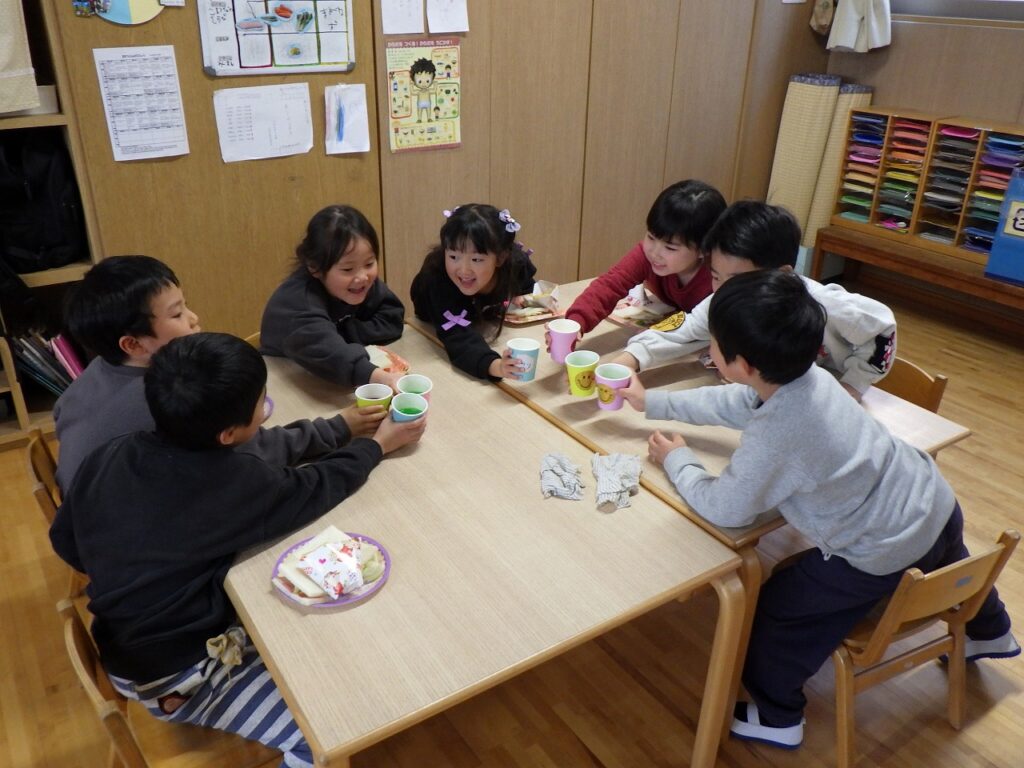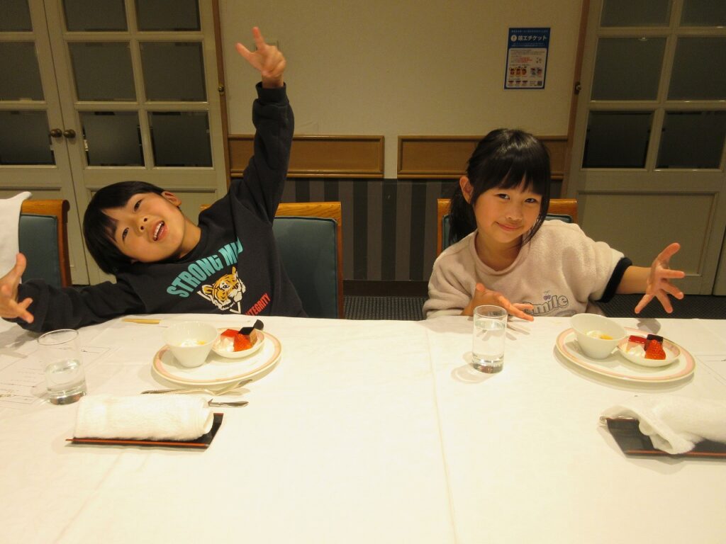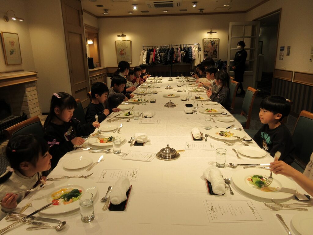 テーブルマナーでは、いつもと違う雰囲気に少し緊張気の様子でしたが、ご馳走を前にすると朗らかな表情に変わりました。園で教えてもらった食事マナーを実践し、最後までフォークとナイフを使い食べることが出来ました。