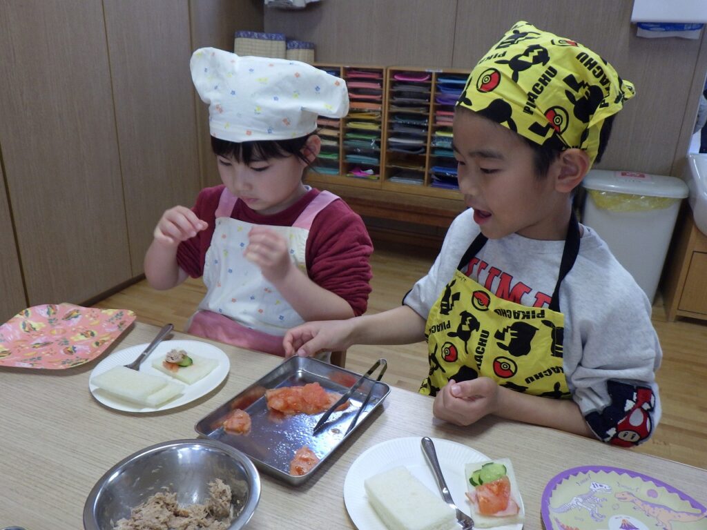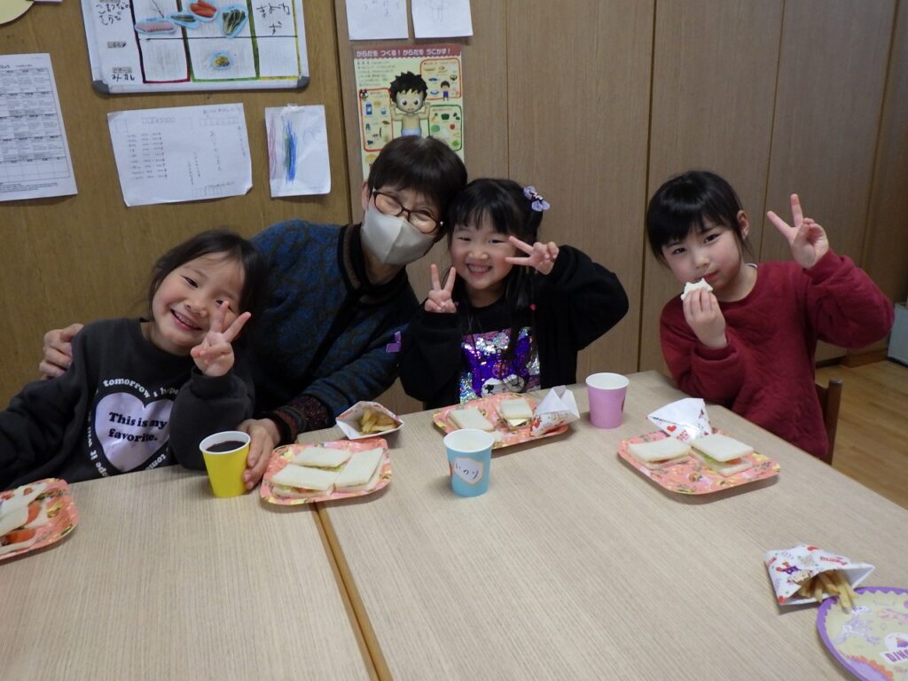 サンドイッチ作りでは、好きな具材をはさみ自分だけのオリジナルサンドを作りました。パンをたくさん重ねたビックサンド、具材全部のせサンドや野菜ジャムサンドなど個性あふれるものができました。子どもたちの好きな音楽をかけながら、楽しく食べることが出来ました。