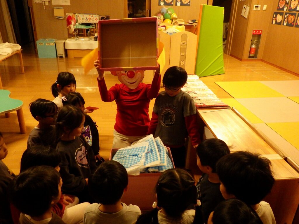 最後に「保育園かくれんぼ」をしました。隠れた先生を子どもたちで探します。棚やカーテンを開けるが、なかなか見つかりません。「ここにいるよ」と開けたら、ピエロが出てきてびっくり😲ゲーム終了時間間際に、全員見つけることができました。ピエロから、プレゼントをもらい大喜びの子どもたち。「もう1回したい」という声もあり『かくれんぼ』大成功でした。