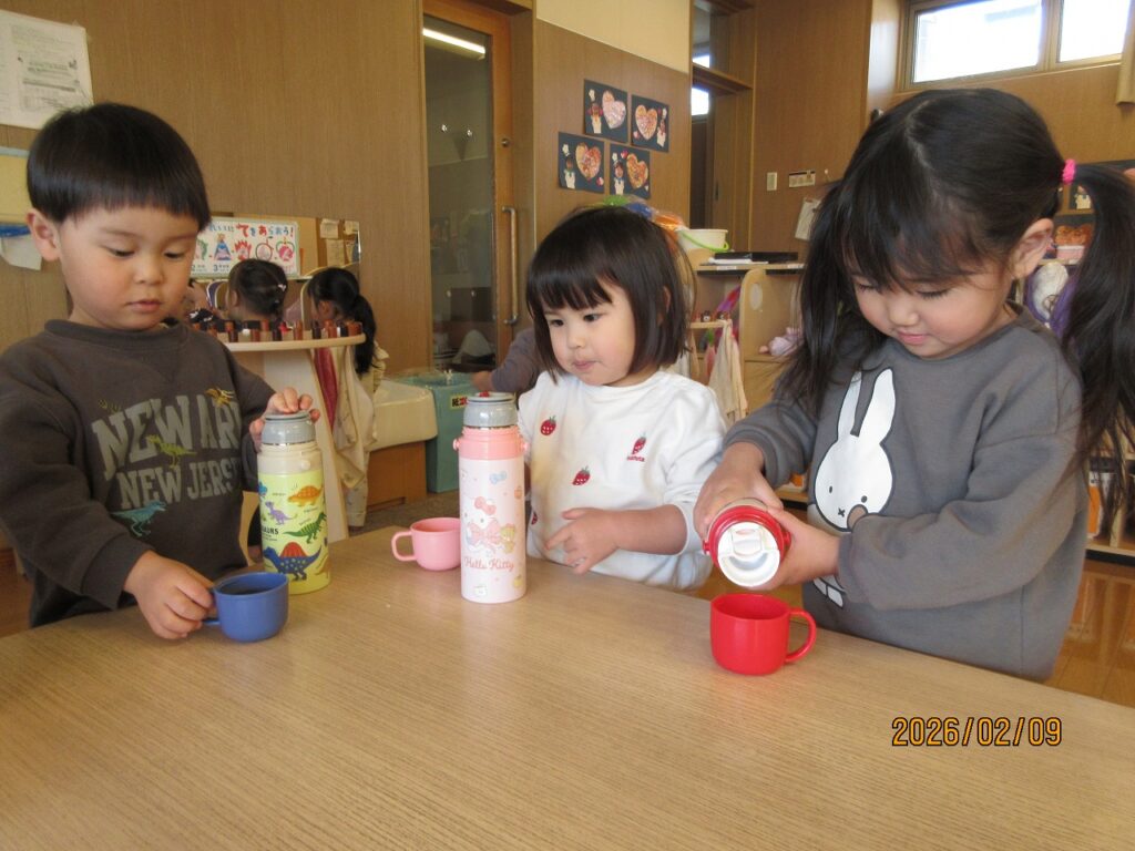水筒も使い始めました。自分で蓋の開け閉めを行い、慎重に注ぐ子どもたち。注ぐことができた嬉しさからか、「もう一回!」と言いながら友達とお茶を飲んでいます。