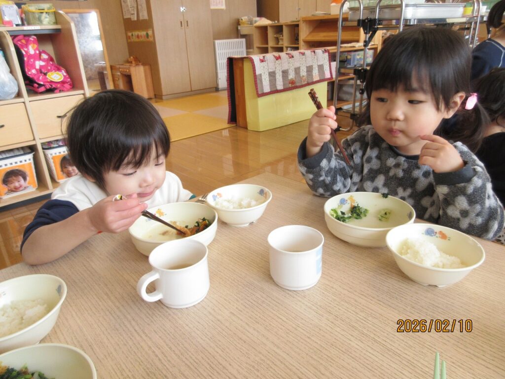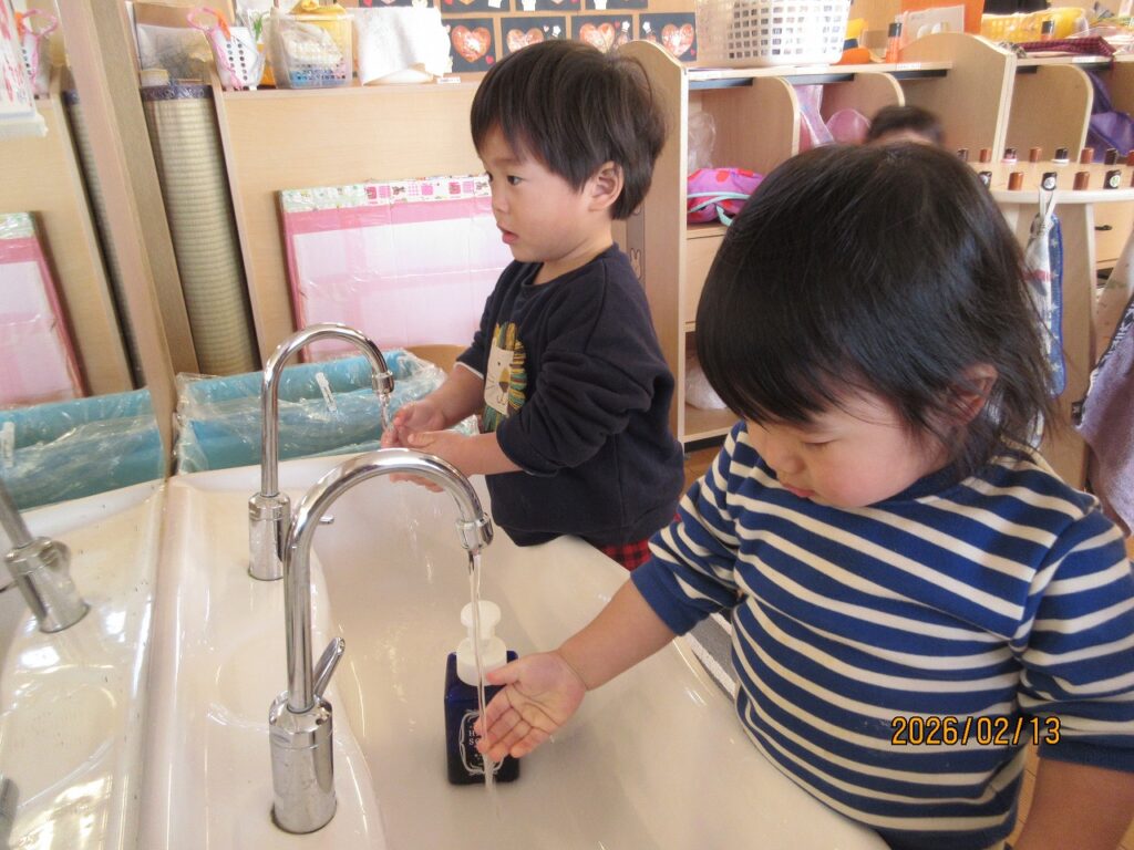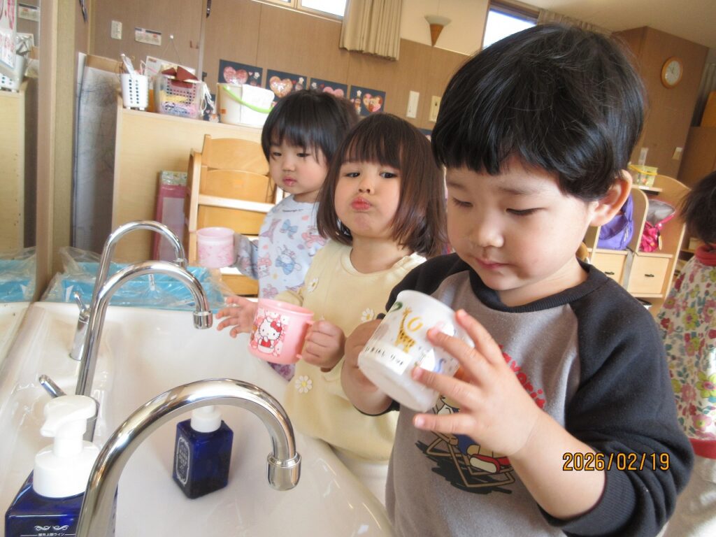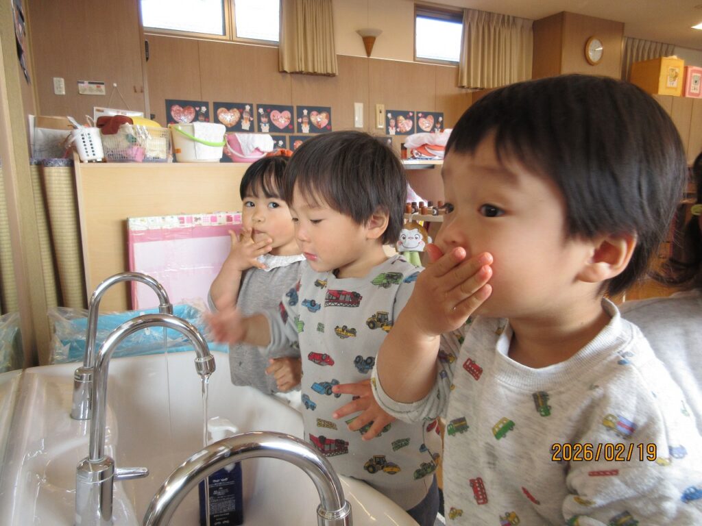 昼食の時間に箸を使いながらご飯を食べている子もいます。「お箸を使いたい!」とやる気満々の子どもたち。箸で上手に食べ物を掴むことができると、「みて―できたよ!」と嬉しそうに保育士や友達に教えてくれます。昼寝の前には、コップを使ってうがいをしています。保育士の手本を見ながら、口を動かしてうがいをする姿が見られてきました。
