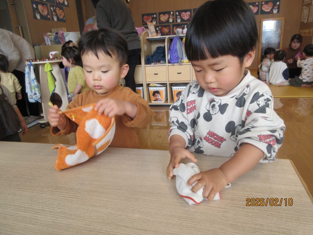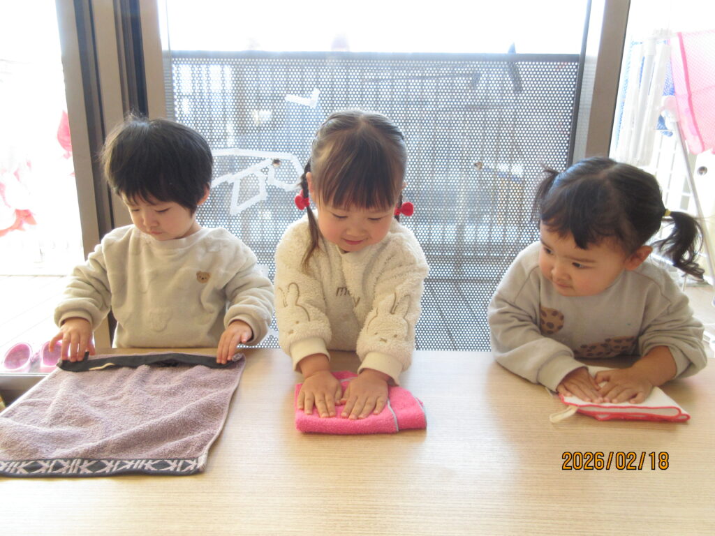 口を拭き終わると、「ぱったん!」と言いながら手拭きタオルを畳んでいます。最初は保育士と一緒に畳んでいましたが、今では「できたよ!」と自分で畳み、カバンの中に片付けています。「できない」「でも自分でしたい」という葛藤と戦いながらも繰り返し取り組むことで「できた」の達成感を味わってきました。毎日の積み重ねを大切にしながら楽しく過ごしていきたいと思います。