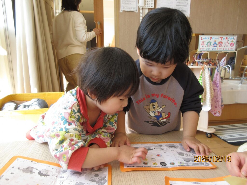 2歳児は、毎朝自分のカバンの中からシール帳を出し、どのシールを貼ろうかなぁと嬉しそうに選んで貼る姿が見られます。初めは、何個も好きな所に貼る様子も見られましたが、今では正しい場所に貼ることができています。