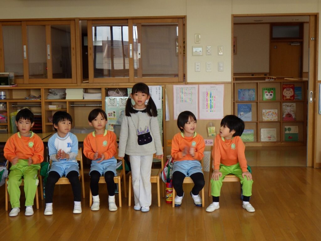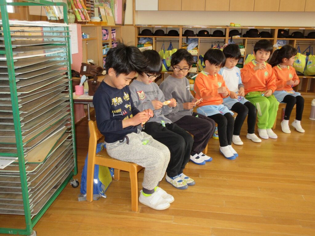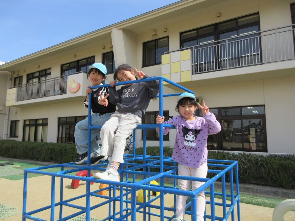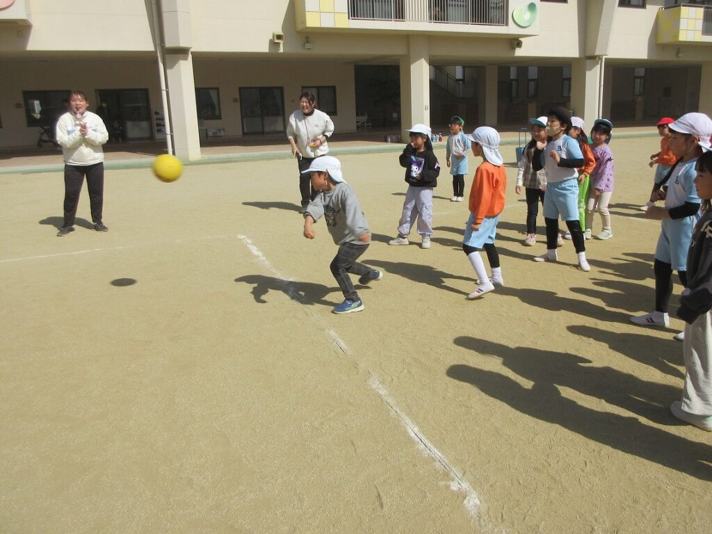 番町幼稚園の校区別の集いに参加し、同じ学校に行く子どもたちと交流しました。自己紹介では、緊張した様子でしたが、自分の番がまわってくると、大きな声であいさつすることができました。「ドキドキドン1年生」を元気よく歌い、おやつを食べ、その後は、子どもたちが楽しみにしていたドッジボールの時間です♬外野に出たボールを同時に拾い、どうするかなと様子を見ていると、「じゃんけんしよう」と話し、どっちが投げるか決めていました。遊ぶ中で自然と友達になっていく姿に成長を感じ嬉しく思いました。最後に、大型遊具で遊び、大喜びの子どもたち‼「なまえはなに?」「これはこうやって登るんだよ」などと話しながら一緒に仲良く遊ぶことが出来ました。