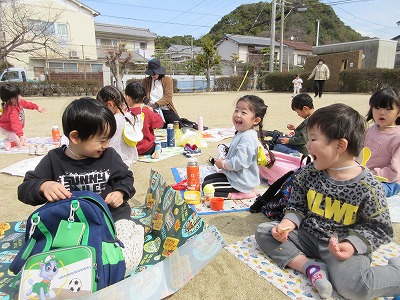 遊んだ後は、みんなのお待ちかねのお弁当タイム♡「先生見てー」「タコさんウインナー入ってるー」など嬉しそうな声がたくさん聞こえてきました!どれも子どもたちが喜ぶ愛情たっぷりのお弁当で、子ども同士が自慢しながら見せ合う姿がとても微笑ましかったです。朝早くからのお弁当作りは大変だったと思います。ありがとうございました。