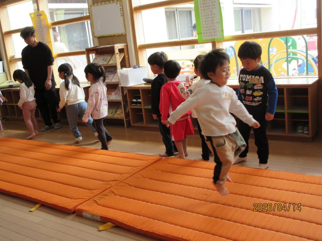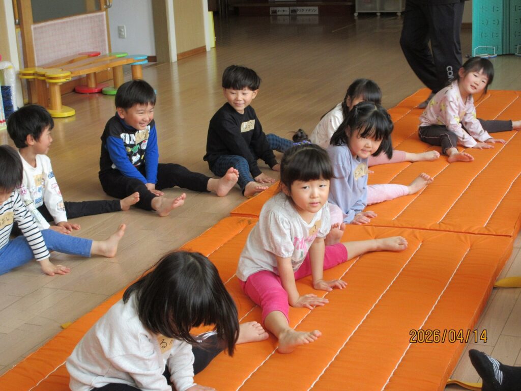 新しいクラスになり、初めての体操教室にらいおん組・ぺんぎん組の子どもたちもドキドキな様子。