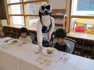 2020.12.24ぴよぴよ テーブルマナー in ひよこレストラン ひよこレストラン開店 ♪ 慣れないフォークとナイフで、悪戦苦闘しながらも豪華なランチに 大満足!! ひよこレストランのシェフにみんなでお礼を言いました ☆