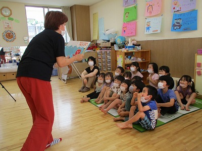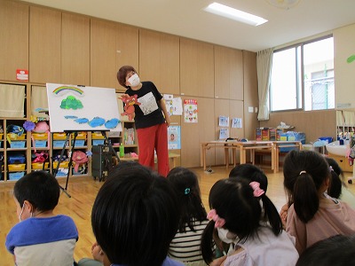 2022.06.17ぴよぴよ えっちゃんお話し会 今日は、「えっちゃんのお話し会」の日! みんな楽しみにしていて、「えっちゃんだ!えっちゃんだ!」と始まるのをワクワクして待っていました。えっちゃんの楽しい読み聞かせや腹話術などに子どもたちは、釘付け!子どもたちの笑顔に保育士たちもうれしくなりました。