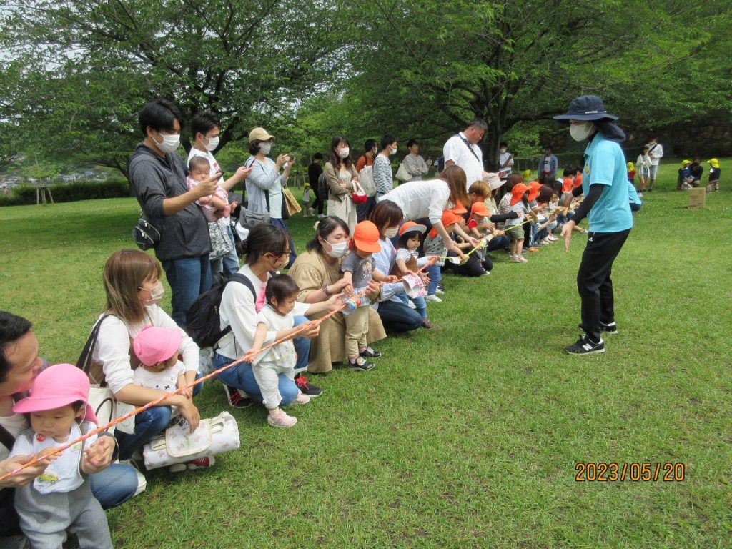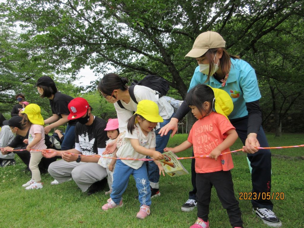 クラス対抗ゲームでは筒通しゲームをしました。各クラス負けないように作戦を練り、いざ勝負!接戦の中優勝したのはらいおん組!景品はなんどバナナの木!バナナは下から上へ育つことを知って、みんなでもぎ取り体験をしました。